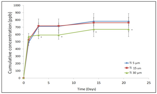 The lower release of Ti ions shown by the Ti-30 µm sample could be explained by its larger particle size, which would lead to a smaller specific surface and, consequently, to a smaller area exposed to the medium, as can be seen in the results shown in Table 1.