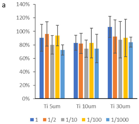 The samples evaluated in the cytotoxicity test showed values slightly above 70% cell survival. In some cases, they showed lower values, although due to the variability of the test, there were no significant differences. It can be seen from the results of the cytotoxicity figures that it is the smaller particles that show lower cytocompatibility values, bordering on cytotoxicity in terms of average values [39,46,47]. However, there are small particles that can be said to be cytotoxic, although strictly speaking, this cannot be affirmed since, in general, the mean values are higher than 70%.