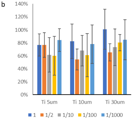 The Ti-5 µm and Ti-15 µm samples showed practically the same titanium ion release values as a consequence of their similar particle size, as can be seen in the results in Table 2. However, there is a tendency for Ti-15 µm to show a higher release, although the results are not statistically significant.