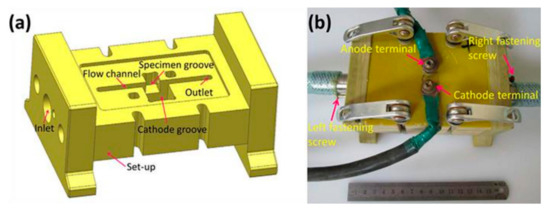 The ECM tests were conducted in constant current mode, a fixed electrolyte flow rate and a close machining time duration at different current densities of 1, 2, 3, 4, 5, 10, 20 and 40 Acm−2, which were tested in galvanostatic flow channel experimental equipment using a high frequency switching direct-current power source (TN-KGZ01 DC 40 V 750A). The ECM cells used in this study are displayed in Figure 2. The distance between the copper cathode and cubic sample anode was a constant value of 1 mm. The samples were weighed before and after the experiment to obtain the actual mass loss. A commonly used electrolyte with a composition of 15 wt.% NaCl solution flowed through the machining gap at a velocity of 1.78 ms−1. The machining surface exposed to the electrolyte was horizontal- and vertical-planes for revealing the anisotropic electrochemical machining properties of the LCD-produced Ti6Al4V alloy. The material removal rate (MRR) during ECM, a key indicator related to ECM properties, is given by