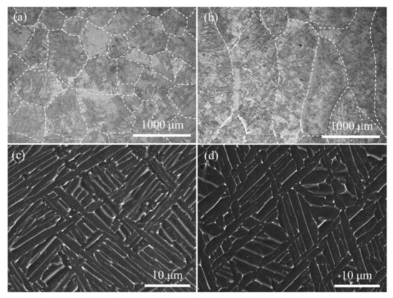 Microstructure of the LCD-produced Ti6Al4V alloy in the horizontal-plane (a,c) and vertical-plane (b,d).