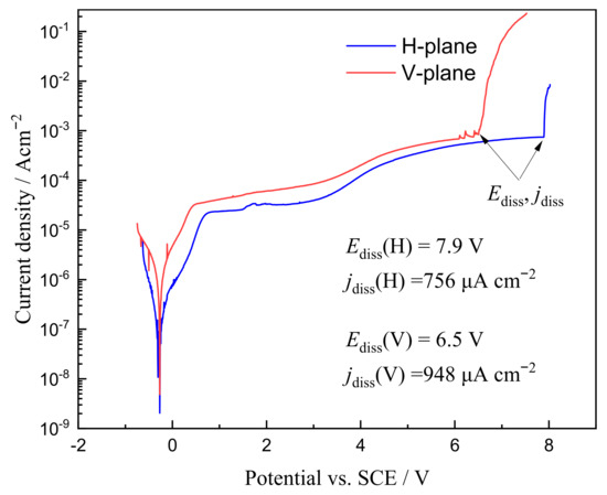 Figure 4 presents the linear sweep voltammetry polarization curves at the horizontal- and vertical-planes of the LCD-produced Ti6Al4V alloy in 15 wt.% NaCl solution. Both measured planes exhibited typical “active dissolution—incomplete dissolution—transpassive dissolution” features for the anodic dissolution behavior of titanium alloy in NaCl solution. From the polarization curves, the transpassive dissolution characteristic parameters, such as critical transpassive dissolution potential (Ediss) and critical transpassive dissolution current density (jdiss), were obtained and commonly used to evaluate the ECM feasibility of a material in a specific electrolyte. Ediss is also known as the pitting potential and breakdown potential of passive films. In this study, a larger potential range for the incomplete passive dissolution region was observed in the polarization curves. Generally, electrochemical polishing was conducted in the incomplete dissolution region, owing to a stable passive film being formed in this potential region. The turning point of the incomplete passive dissolution and transpassive dissolution regions is the minimum machining voltage and current density values required for ECM.