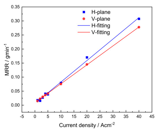 Figure 5 displays the material removal rates for the horizontal- and vertical-planes of the LCD-produced Ti6Al4V alloy during ECM at different current densities. Both the horizontal- and vertical-planes exhibited linearly increasing material removal rates with an increasing current density. It is well known that the NaCl solution is a linear electrolyte for titanium alloys and hence results in a linear proportional relationship between the material removal rate and current density in the stable transpassive dissolution potential range. This also suggested that the linear proportional relationship between the material removal rate and current density was determined by the composition of the material and electrolyte but did not change with the different microstructural characteristics. It is worth noting that the slope of the material removal rate with the current density in the horizontal-plane is larger than that in the vertical-plane. Thus, it can be concluded that the material removal rate in the horizontal-plane is higher than that in the vertical-plane at high current densities. In contrast, the horizontal-plane has a lower material removal rate in comparison to the vertical-plane when machined at low current densities.