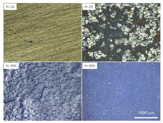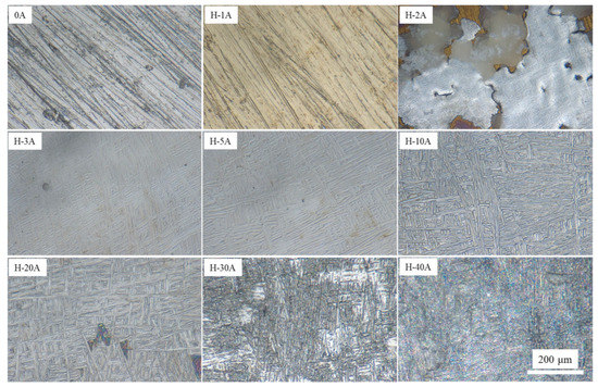 The dissolution surface morphology not only reflects the machining surface quality but also contains a wealth of information revealing the electrochemical dissolution mechanism. Figure 6 shows the dissolved surface morphologies of the horizontal-plane with different current densities ranging from 0 to 40 Acm−2. Sample 0A represents the original surface before ECM, which was sanded with 1500 grit SiC sandpaper and had a roughness of 9.5 μm. When the horizontal-plane was machined at a current density of 1 Acm−2, the surface color changed from gray to dark yellow, but the dissolved surface morphology did not change. It is suggested that higher valence titanium oxides were formed on the surface of sample H-1A, and that the electrochemical dissolution rate was relatively slow. As the current density increased to 2 Acm−2, the surface of the sample exhibited obvious inhomogeneous dissolution characteristics. The dissolved surface morphology contains a silver-gray dissolved zone, dissolved product attachment zone and golden-oxide-covered zone. Samples H-3A and H-5A had similar dissolved surfaces, both showing relatively flat and shallow etched metallographic features. Similarly, samples H-10A and H-20A both exhibited relatively flat but deeply etched metallographic features. With a further increase in the machining current density to 30 and 40 Acm−2, the metallographic characteristics of the dissolved surface can no longer be observed, showing a smoother surface.
