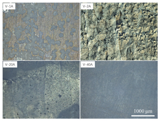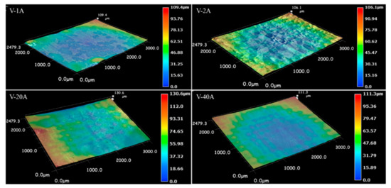 To compare the difference in the ECM characteristics between the horizontal- and vertical-planes under different machining current densities, the macrodissolved surface morphology of the vertical-plane with special typical characteristics was also observed. Figure 9 and Figure 10 display the macrodissolved surface morphologies and their 3D topography nephograms for the vertical-plane with special current densities of 1, 2, 20 and 40 Acm−2, respectively. Obviously, sample V-1A exhibited black dissolved products, and a golden matrix composed the macrodissolved surface. For sample V-2A, faintly visible columnar grain morphologies on the dissolved surface were observed. The macrodissolved surface of the vertical-plane machined at a high current density of 20 Acm−2 possessed an overall uniform dissolution. When the current density was increased to 40 Acm−2, the macrodissolved surface appeared brown and flat.