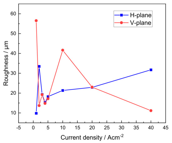 Roughness for the microdissolved surface of horizontal- and vertical-planes with different current densities.