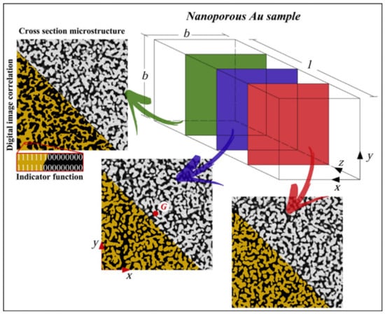 The NP Au sample with sides and . The 256 sections obtained by SBF-SEM have been transformed by digital image correlation in a voxel structure. Gold and black colors indicate solid and void phases. The indicator function is equal to 1 for solid and 0 for void phases.