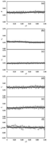 The NP (a) Volume fraction , (b,c) centre of mass position , and (d–f) moments of inertia along the longitudinal direction . The average values , and are shown as black continuous lines.