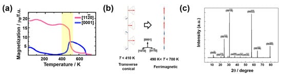 Figure 1a shows the magnetization of the Z-type hexagonal ferrite as a function of temperature measured at 50 mT. The magnetization drops along the direction are observed at approximately 410, 490, and 680 K. Meanwhile, the magnetization parallel to the [0001] direction (c-axis) increases at 410 K followed by drops at 490 and 680 K. This suggests that the hexagonal crystal’s transverse-conical spin state on the basal plane is stabilized below 410 K. Furthermore, the easy axis of the magnetization changes parallel to the c-axis at 490 K, followed by the paramagnetic state above 680 K. Similar magnetization transitions were observed in the magnetic properties measurement using PPMS on Ba3Co2Fe24O41 hexaferrite [8]. The transition of the magnetic spin state is illustrated in Figure 1b. The magnetic symmetry of a cycloidal spiral spin arrangement is known to induce spontaneous ferroelectric polarization where the magnetic propagation vector () lies in the spiral plane. The origin of magnetically driven ferroelectricity can be successfully explained by the spin current and inverse Dzyaloshinskii–Moriya models [18,19]. These models can also be applied to the transverse-conical spin arrangement in Z-type hexagonal ferrites. XRD pattern of the sample is shown in Figure 1c. The diffraction peak intensity maxima is observed for around 2θ = 30.80, corresponding to a plane of . This c-plane should be appeared dominantly when the specimen of the hexagonal structure is ground down, and to favorable orient normal to the c-plane for the XRD measurement. The peaks were well indexed to the Z-type hexaferrite, with a space group P63/mmc and lattice parameters a = 5.87 (3) Å and c = 52.23 (2) Å (ICSD #98328), which suggests that the majority phase of the sample is Z-type hexaferrite.
