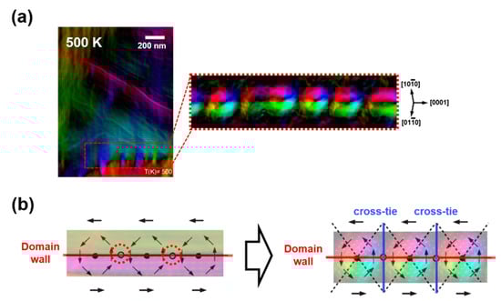 A noticeable point in the magnetic transition process is the appearance of the cross-tie domain wall right after the rotation of the magnetic domain wall (Figure 5a). The energy per unit area of a conventional domain wall is expressed as , where is the effective anisotropy constant and A is the exchange constant [22]. At the magnetic transition temperature, the constants associated with magnetic anisotropy were minimized, yielding a weak magnetocrystalline anisotropy (MCA) of the sample [1,7,22]. Under low anisotropies, demagnetizing fields that are normal to the domain wall can rotate the magnetization in each domain in the direction of the wall to make the flux closure represented by the red-dotted circles in Figure 5b (left) [23]. However, this flux closure is only possible in alternate intervals, and the magnetostatic energy density is increased between these regions. The flux flow discontinuity in the circles can be accommodated by developing the cross-tie walls shown in Figure 5b (right) [23,24,25]. The cross-tie walls reduce the angular shift in the flux direction normal to the main wall. This configuration gives rise to such periodic magnetic vortices across the main 180° domain wall, as shown in Figure 5a [26].
