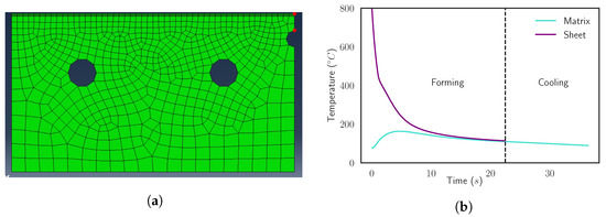 (a) Location of the reference nodes in the mesh. The upper red point is the sheet reference node (S) and the lower red point is the die reference node (D). (b) Evolution of the reference points’ temperatures during a complete press hardening simulation cycle.