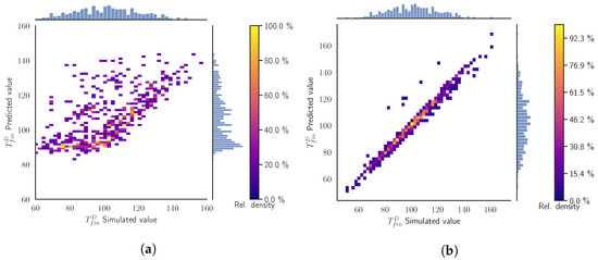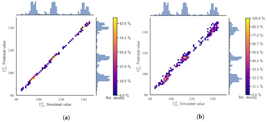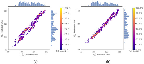 Validation Scenario 1: Predicted values as function of the simulated output values of the . The histograms and the color map represent the relative counts as function of the temperature. (a) SModA and (b) SModB.