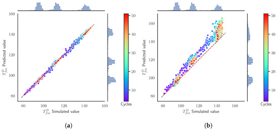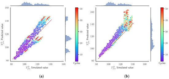 Validation Scenario 4: Predicted values as function of the simulated output values of the . The histograms represent the relative counts as function of the temperature and the color map indicates the cycle. (a) SModA and (b) SModB.