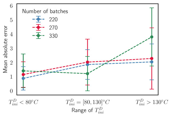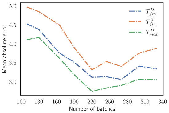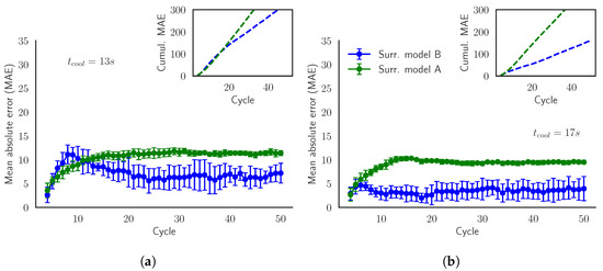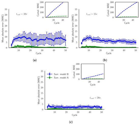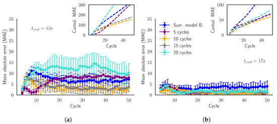 Figure 8 represents the MAE and the cumulative MAE of the predictions of for each cycle within the batches in the validation set. We observe how the SModA has a nearly perfect prediction for the previously commented reasons. Furthermore, the error of SModB is accumulated in the first cycles and after that it remains constant or even decreases. Additionally, we confirm that this model works better for higher values of , i.e., for lower temperatures. The explanation can be found in the training sets. In Figure 3a (where the parameters are the same as in the current validation set), the stationary region of the curves of = 10 s is not reached until cycle 15, in which the stationary region achieves temperatures around 140 °C. Figure 8 shows the important accumulation of error in the transient region for the SModB, and when = 10 s, the transient region lasts more cycles. Besides, looking at Training Set B, the interval of temperatures around 140 °C in Figure 3b is not very populated. These are the main causes of the loss in the predictive power of the SModB for low values of . Summarizing, the transient region is the main source of error for the SModB, since the mean absolute error increases in the first cycles, while in the stationary region it is kept constant.