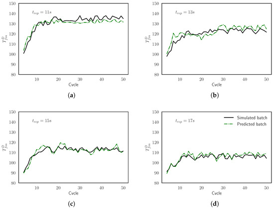 Comparison between the simulated curves and the predicted curves for the final surrogate model of evaluated for batches with (a) 11 s, (b) 13 s, (c) 15 s, and (d) 17 s.