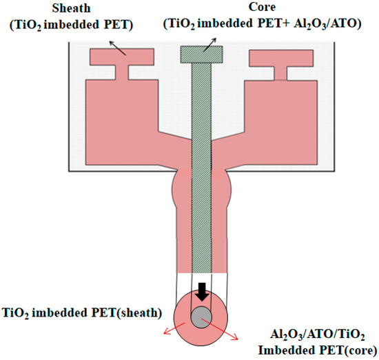 Three types of Al2O3/ATO/TiO2-imbedded PET yarns were prepared on a bi-component melt spinning machine (TMT Co. Ltd., Kyoto, Japan), which is shown in Figure 1. Figure 1 shows a schematic diagram of the sheath/core typed bi-component melt spinning machine used in this study. Before yarn spinning, first, Al2O3 and ATO master batch (M/B) chips were made using the mixed polymers combined with 20 wt.% Al2O3 and ATO particles each and 80 wt.% PET chips on the compounding machine (SM Platek Co., Ltd., Ansan, Korea). Both Al2O3 and ATO M/B chips were combined with a mixing ratio of 0.8 wt.% Al2O3 (2 kg) and 0.3 wt.% ATO (0.75 kg), which was mixed with TiO2-imbedded PET base polymer (47.25 kg) in the core part in the bi-component melt spinning machine. The mixing ratio of the M/B chip to make Al2O3/ATO sheath/core PET yarn specimens is presented in Table 1.