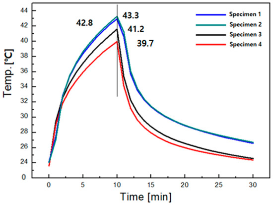 As shown in Figure 4, the maximum temperature of fabric specimens 1, 2 and 3 was higher than that of fabric specimen 4 due to the greater heat emission from the Al2O3/ATO/TiO2 particles imbedded in the yarns of fabric specimens 1, 2 and 3 than from TiO2 particles imbedded in the fabric specimen 4, which was verified by the FIR emission characteristics of the fabric specimens shown in Table 4.