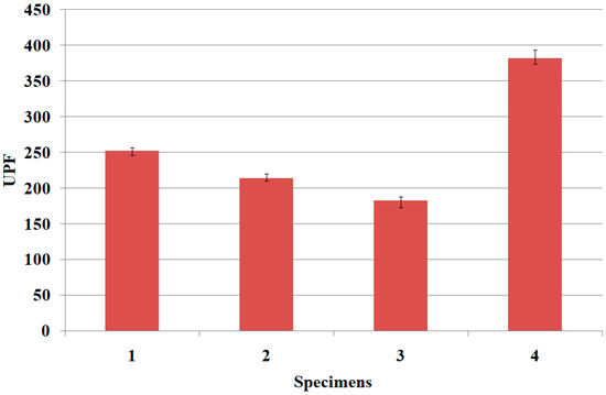 Table 5 lists the UPF, rub-voltage and surface electrical resistivity of the four fabric specimens. The deviation in Table 5 is the difference between the maximum and minimum values of the experimental data. ANOVA (F-test) was carried out to verify the statistical significance of the experimental data shown in Table 5. Table 6 lists ANOVA data for the physical properties of the four fabric specimens. The mean value among the four fabric specimens for UPF, rub-voltage and SER was statistically significant, as F0 (V/Ve) > F (3, 16, 0.95) and p < 0.05. Figure 5 presents the UPF of the fabric specimens.
