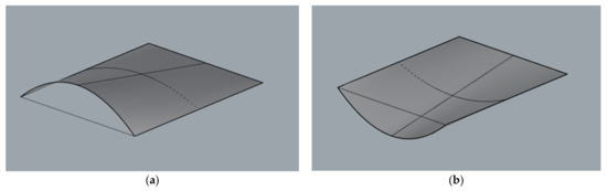 As has been noted previously, due to their geometric properties, Catalan surfaces are applied as geometrical shapes for the formation of roofs [16,39]. However, the hyperbolic paraboloid, which is the surface of second order, is the most widely used. Due to their double curvature, hyperbolic paraboloids are exceptionally stiff and this is the reason for their common application. They are also widely discussed in the literature [24,37]. The cylindroid and the conoid are not as popular; however, they deserve attention as they can constitute interesting modular forms for the composition of compound roofs. Due to this fact, finite models of cylindroids and conoids have been considered as the roof’s units.