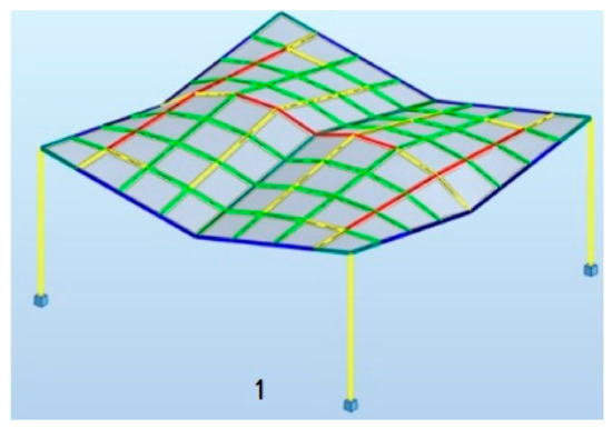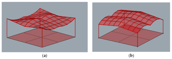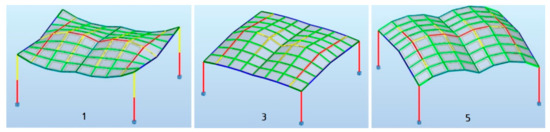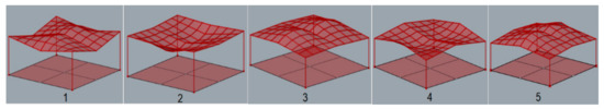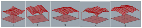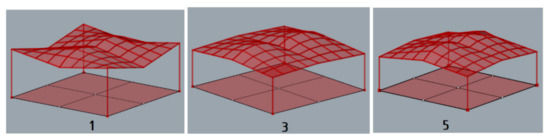 According to [1], maximum deflection for all structures was established equal to 3.8 cm. During the simulation, each structure was assumed to be loaded with its own weight and the structures’ masses were optimized taking into account the maximum allowable deflection. As the results of the performed simulations, five geometries of the roof structures composed of cylindroid units with the minimal masses, presented in Figure 5, and five roof structures with the conoid units with the minimal masses, presented in Figure 6, were established.