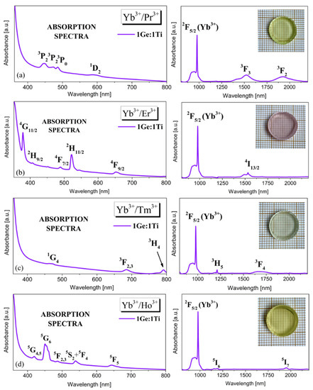 In this study, measurements of the absorption spectra of glass systems 1Ge:1Ti co-doped with Yb3+/Ln3+ (Ln = Er, Pr, Tm, Ho) were carried out and presented in Figure 1.