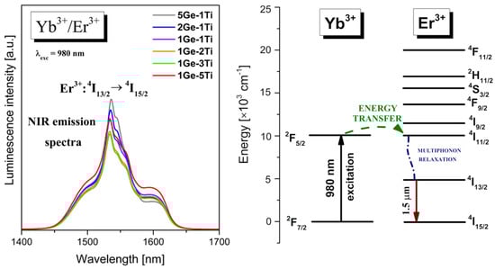 From the literature [38,39,40], it is well known that broadband near-infrared emission bands of Er3+ ions in inorganic glasses depend strongly on their chemical compositions. The rapid development of optical telecommunications requires the broadening of the near-IR range for erbium-doped fiber amplifiers (EDFA), in which signal transmission occurs at about 1500 nm. In fact, the EDFA systems based on silicate glasses [41,42] exhibit relatively narrow bandwidth, which contributes to the limited near-infrared broadband transmission. For that reason, many precursor glass systems singly doped with Er3+ and co-doped with Yb3+/Er3+ are still tested and selected in order to obtain enhanced near-IR luminescence in the so-called third telecommunication window. Figure 3 presents near-IR emission spectra measured in the wavelength range from 1400 nm to 1700 nm for Yb3+/Er3+ co-doped titanate–germanate glasses under excitation by a 980 nm line. Near-IR emission bands centered at about 1.53 μm correspond to the 4I13/2 → 4I15/2 transition of Er3+.