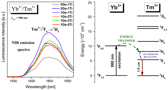 Thulium is another well-known lanthanide dopant, which is introduced to various glass systems in order to generate near-IR luminescence at about 1.8 μm [47]. In particular, co-doping with Tm3+ and Yb3+ ions is an excellent way to achieve enhanced near-infrared emission by using a 980 nm wavelength as an excitation source [48]. Figure 4 shows near-IR emission spectra of series titanate–germanate glass samples co-doped with Yb3+/Tm3+. Near-IR emission bands centered at 1.8 μm are associated with 3F4 → 3H6 transition of Tm3+. The intensities of near-IR emission bands increase and then decrease with increasing TiO2 concentration in the glass composition. The highest intensity of emission band related to the 3F4 → 3H6 transition of Tm3+ was observed for sample 1Ge-1Ti, where the molar ratio GeO2 to TiO2 is close 1:1. The energy level diagram for Yb3+/Tm3+ co-doped titanate–germanate glasses is shown in Figure 4.
