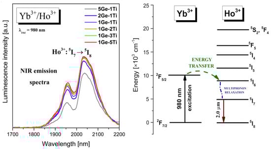 These glass systems present near-IR emission at 2 μm due to the 5I7 → 5I8 transition of Ho3+ [51,52]. The energy transfer mechanism has been mentioned in the literature by Wang et al. [53]. Upon excitation wavelength at 980 nm, the excited level of Yb3+ is well populated and then the excitation energy is transferred from the 2F5/2 state of Yb3+ to the 5I6 state of Ho3+. The energy transfer process Yb3+ → Ho3+ is non-resonant. In the next step, very fast multiphoton relaxation to the lower-lying 5I7 level of Ho3+ is observed and consequently, we can observe near-IR emission at about 2000 nm associated with the 5I7 → 5I8 transition of Ho3+ [54,55]. Figure 5 presents near-IR luminescence spectra measured for titanate–germanate glasses co-doped with Yb3+/Ho3+. The emission bands are more intense for glass samples containing higher concentrations of TiO2. All transitions are also indicated in the energy level diagram, which is shown in Figure 5.