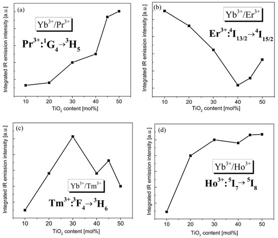 The integrated intensities of emission bands of rare-earth ions Yb3+/Pr3+ (a), Yb3+/Er3+ (b), Yb3+/Tm3+ (c) and Yb3+/Ho3+ (d) vary with TiO2.