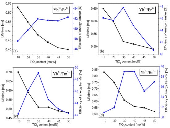 The measured luminescence lifetime and the energy transfer efficiency Yb3+ → Ln3+ (where Ln = Pr (a), Er (b), Tm (c), Ho (d) in the function of TiO2 content.