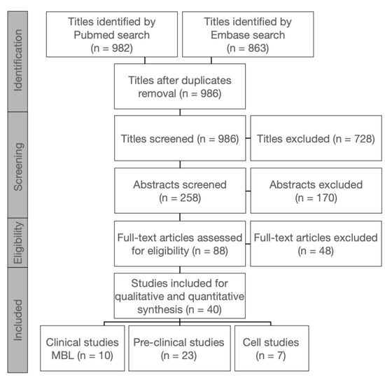 The electronic data base search and the respective results are displayed in Figure 1. For the clinical studies, only those displaying the latest results of the same study population are listed by the first authors’ name (n = 10). However, short-term data were extracted from previous studies of the respective population whenever data on MBL were missing in the latest reports.