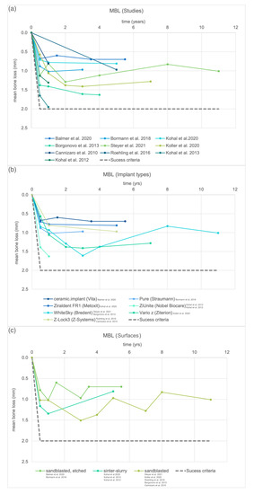 Details on clinical studies are given in Table 1. Implants with sandblasted surfaces that were inserted in five of the studies [18,28,29,30,31] displayed survival rates between 77.3 and 100%. The survival rates of implants with sinter and slurry on the endosseous surface ranged from 94.3 to 98.2% [17,32,33]. The survival of sandblasted and etched surfaces that were used in two prospective studies ranged from 97.5 to 98.4% [16,19]. The MBL obtained at the respective follow-ups is displayed in Figure 2a. Following the consensus for titanium implants, an MBL of 2 mm at most was considered a threshold value for success [34]. The data of the same implant types were pooled in Figure 2b. The lowest MBL was observed with the implant ceramic.implant (Vita, Germany). The MBL was pooled by surface treatments in Figure 2c. Overall, the lowest MBL was reported for sandblasted and subsequently etched surfaces, followed by a sinter and slurry treatment and sandblasted surfaces. However, data of up to 11 years were included for sandblasted surfaces, while for the others, data between 3 and 5.5 years are currently published.