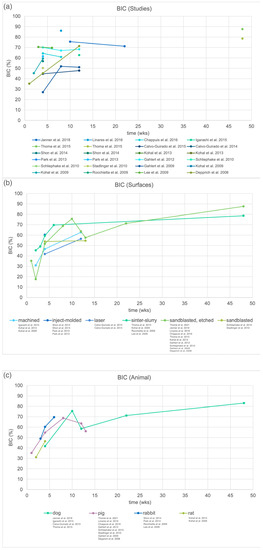 The BIC at the respective intervention time for each study is displayed in Figure 3a. Similar surface treatments were pooled in Figure 3b. No clear preference of one surface treatment is observable. Figure 3c shows the BIC pooled by the animal model for zirconia implants. The rabbit and rat models display a short intervention time with a fast osseointegration; however, with the rabbit model, higher BIC values were reported. The BIC with the pig model decreased again after 8 weeks. For the dog model, osseointegration progressed slower and required observation periods of up to 48 weeks.