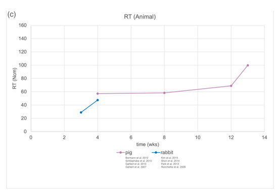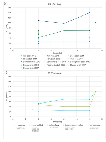Figure 4a reveals the RT at the different intervention times for each included preclinical study. Similar surfaces were pooled in Figure 4b. For machined surfaces, a lower RT was reported than for modified surfaces that were sandblasted or etched. Studies comparing the RT of zirconia implants with different surfaces within the same set-up found higher values for rougher surfaces [53,61,67]. When the RT was pooled by the animal model in Figure 4c, the RT in the rabbit model strongly increased between 3 and 4 weeks. For the pig model, a slight increase was reported between 8 and 12 weeks that progressed further afterward.