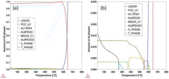 Thermo-Calc prediction results of the Al6061 alloy demonstrating the amounts of phases as a function of temperature: (a) whole range of the prediction; (b) narrow range showing the secondary phases.