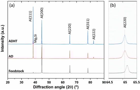 Figure 2 shows the XRD characterization results of the Feedstock, AD, and ADHT samples. Consistent with the Thermo-Calc prediction, the main peaks of the samples belonged to the FCC-Al phase. Following a close observation, a weak diffraction peak of the Mg2Si phase was also observed for all three samples around the diffraction angle of 40.2°. Figure 2b shows the diffraction peak of FCC-Al(200) within the narrow XRD diffraction angle range from 64.5° to 65.5°. Interestingly, the diffraction peaks of the AD and ADHT samples nearly overlapped each other, while that of the Feedstock shifted to the larger diffraction angle side. According to Bragg’s equation, the increase in diffraction angle indicates the decrease in interplanar spacing, equally meaning the decrease in lattice parameters. Therefore, after the AFS-D process, the lattice parameters of the AD and ADHT samples increased, which implies that the precipitates dissolved back into the Al matrix as solid solutes. A similar phenomenon has also been observed by other researchers [20,33]. The dissolution of precipitates after AFS-D processing can be explained by the temperature profile during the AFS-D process. A temperature above 250 °C would trigger the dissolution of precipitates in the Al6061 alloy [34]. Moreover, it has been reported that with an inserted thermocouple in the fabrication substrate, the temperature during the AFS-D process can reach up to 500 °C [20,25], which is sufficient to initiate the precipitate dissolution process.