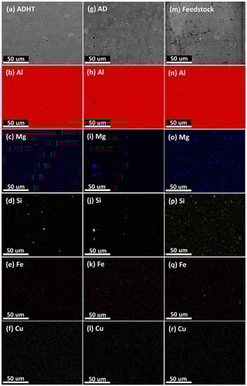 The compositional distributions in the samples are shown in Figure 3. Based on the measurements, Al was clearly observed as the matrix element. Mg and Si were also obvious as the primary alloying elements existing as Mg2Si phase or T-Phase (according to Thermo-Calc prediction and XRD test results), which play a significant role in strengthening the Al6061 alloy [35,36]. Meanwhile, due to their much lower contents, Fe and Cu were hardly seen, especially the latter. By comparing the distribution of the elements Mg and Si, differences were discovered in the three samples. Precipitates of Mg and Si elements distributed uniformly in the Al matrix in the Feedstock sample (Figure 3n–p). However, in the AD sample, precipitates became larger, which is apparent in Figure 3h–j. After T6 heat treatments, precipitates became smaller again (Figure 3b–d). The variation in behavior observed in the precipitates in the samples can be explained below. AFS-D is a thermophysical process, and the frictional heat results in a temperature of the fabrication zone up to 500 °C [20,25]. During the layer-by-layer fabrication process, heat accumulates, holding an elevated temperature inside the deposited parts (acting as a dynamic heat treatment process), which causes precipitates to grow. It is worth noting that only micro-sized precipitates could be observed with the EDS mapping results in this study. Nano-sized precipitates, i.e., the β″ phase (Mg5Si6), also exist in Al6061 alloys, especially after T6 heat treatments [36,37,38].