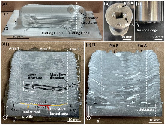 Photos illustrating the as-deposited Al6061 alloy parts (a), overview of the tool with pin structures (b), side view of the tool (c), cross section along Cutting Line I after etching (d), and cross section along Cutting Line II after etching (e).