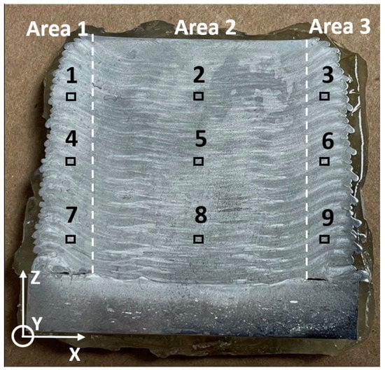 Figure 5 indicates the spots for the microstructural tests on Cross Section I (Figure 4). Three spots lay in each area uniformly distributed on the same line along the build direction (Z-axis). Likewise, three spots from the three areas, for example, Spots 1, 2, and 3, were on the same horizontal level. The selection of the test spots aimed at evaluating the microstructural evolution along both the building direction (Z-axis) and horizontal direction (X-axis).