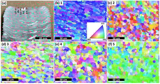 Microstructural examination of the last deposited layer. (a) The positions of the test spots on the sample cross section. Spot 1: center of the top layer; Spot 2: the point the mass flow started contacting the first pin; Spot 3: the region close to the top of the first pin; Spot 4: the region between the first and second pin; Spot 5: the region close to the top of the second pin. (b–f) The EBSD inverse pole figure (IPF) orientation maps of Spots 1–5, respectively.