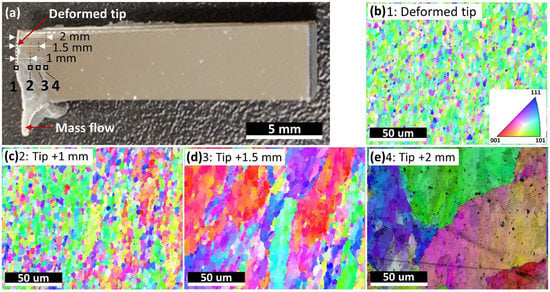 Images showing the residual feedstock and its microstructures. (a) A photo illustrating the shape of the quarter residual feedstock with Spots 1, 2, 3, and 4 being the microstructural characterization regions. Spot 1 was right on the deformed tip, while Spots 2, 3, and 4 were 1 mm, 1.5 mm, and 2 mm vertically away from the deformed surface. (b–e) EBSD inverse pole figure (IPF) orientation maps of Spots 1–4.
