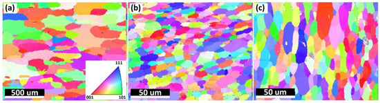 Figure 6 shows the EBSD inverse pole figure (IPF) orientation maps on the cross section shown in Figure 5. Generally in good agreement with the etched cross sections observed in Figure 4, the grain structures were symmetric to the central line of the cross section, with equiaxed grains in Area 2 and elongated grains in Area 1 and Area 3 following the mass flow direction. No significant grain-size differences were observed in the three spots for each area, indicating uniform grain size distribution along the building direction (Z-axis). A similar observation has also previously been reported [24]. AFS-D is a solid-state fabrication process; however, a relatively high temperature is generated and held inside the deposited part, which can be up to 500 °C in Al alloys [20,25]. Therefore, dynamic heat treatment was performed on the deposited part due to the temperature. Earlier deposited layers were kept in the high-temperature state for a prolonged time. Considering the grain size results observed above, it is reasonable to state that the grain size of the deposited part was mainly dependent on the maximum processing temperature. In real applications, components with isotropic mechanical performance are preferred [13]. Isotropic crystallographic orientations (equiaxed grains) typically lead to isotropic mechanical properties [39], while elongated grains result in anisotropic mechanical behaviors [40]. Further, unlike Area 2, only a “kissing” attachment existed between layers in Areas 1 and 3 rather than metallurgical bonding, which are called flash regions. In real applications, Area 1 and Area 3 would be removed in multi-pass AFS-D processes or by post AM machining. In the remainder of the text, only Area 2 is considered for investigation for the as-deposited sample both before and after heat treatments. The average grain size for Area 2 was measured to be 8.5 ± 3.1 µm.