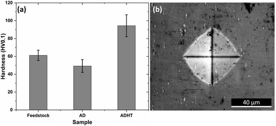 To gain an understanding of the mechanical performance of the Feedstock, AD, and ADHT samples, Vickers hardness tests were performed, and the test results are shown in Figure 10a. Clearly, the ADHT sample showed the highest hardness (94.4 ± 12.3 HV0.1), while Feedstock had the medium hardness values (61.2 ± 5.8 HV0.1), and the AD sample possessed the lowest hardness (49.2 ± 7.2 HV0.1). This observation shows a clear discrepancy with that of the grain-size results. Figure 10b shows the indentation shape and size on the surface of the AD sample after the Vickers hardness test. The diagonal length was around 57 µm, which covered multiple grains. Therefore, the Hall–Petch effect (grain boundary strengthening) was not the main strengthening mechanism for the AD and ADHT samples. As mentioned above, Al6061 is a precipitate-hardening alloy; the precipitate conditions, including precipitate sizes and amounts, show a significant effect on the mechanical performance. According to Figure 2, it was found that Feedstock contained more precipitates, while the AD and ADHT samples had lower but almost identical amounts of precipitates. In addition, according to Figure 3, the precipitates in the AD samples grew to larger sizes than their counterparts, indicated by the EDS mapping results for the elements Al, Mg, and Si. Apart from the micro-sized Mg2Si precipitates observed in Figure 2 and Figure 3, nano-sized precipitates existed in the Al6061 alloy, especially after the T6 heat treatments, specifically the needle-shaped β″ meta stable phase [43], which is the main strengthening phase for heat-treated Al6061 alloys [44]. Precipitation strengthening results from the ability of precipitates to restrain the movement of dislocations.