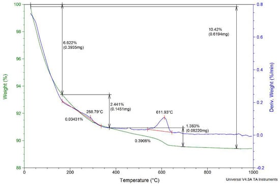 The TGA/DTG curves of the NZ1 zeolite are presented in Figure 3. The zeolite was heated from room temperature to 1000 °C at a rate of 10 °C min−1 in an N2 atmosphere. TGA analysis showed three regions depending on the activation temperature values of the zeolite samples: the first region, from room temperature to 200 °C, is attributed to evaporation of water; the second region, between 200 and 400 °C, corresponds to dealumination of zeolites. According to Garcia-Basabe et al. [], dealumination of natural zeolite begins before 150 °C and was associated with the lack of extra-framework cations and the strongly bound water molecule within the pore. Another explanation could be the depolymerization of T–O–T bonds (T = Si, Al) and the appearance of the soluble silicates []. The third region is the domain 400–800 °C where significant loss of biomass occurs. This temperature range could be associated with the decomposition of zeolite at high temperatures. The activation of natural zeolites was realized using a rigid framework including pores and channels created by a tetrahedral TO4 structure. The thermal activation of zeolites at 200 °C enhanced pore volume by removing the water molecules.