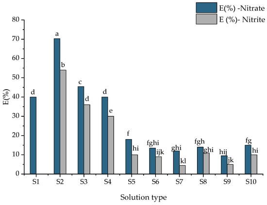 Nitrate and nitrite removal efficiency (E, %) depending on sample types. Data are the mean ± standard deviation (n = 3). Means with different letters (a–k) above the bars indicate significant differences based on Tukey’s test (p < 0.05).