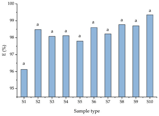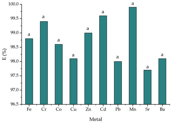 The metal removal efficiency in the S10 sample. Data are the mean ± standard deviation (n = 3); the same letters show no significant difference (p > 0.05).