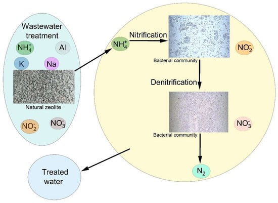 Zeolites can be used successfully to improve the performance of wastewater treatment plants, and can provide a stabilizing effect, both in the short term and for the sedimentation of activated sludge and bacterial mass [,]. They not only act as agents that favor the settling of sludge but also as supports for the growth of bacteria, thus fulfilling a function similar to that of a suspended bacterial growth system. Zeolitic material functions as a weighting agent, a substrate and structural unit for bacterial growth. In wastewater treatment, the cultivation of bacteria assimilated to the composition of wastewater influences the performance of the treatment process. In order to obtain a high level of water purification, it is mandatory to determine the optimal amount of zeolite to be used []. This amount should not be too large because the bacteria must grow and create a culture on the zeolitic material. This is directly related to the retention time of the solids. Skleničková et al. [] used zeolites as filters in fish-breeding recirculation systems and studied their effects on nitrifying bacteria. According to their study, zeolites are able to remove more ammonium cations than the nitrifying bacteria used in biological filters—such as Nitrosomonas and Nitrospira species. Additionally, Perez et al. [] used natural zeolite as support for treatment of synthetic swine wastewater in an expanded granular sludge bed (EGSB) reactor for 255 days, which resulted in a positive influence on microbial community formation.
