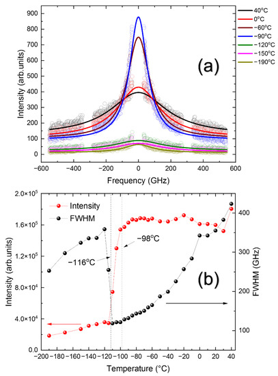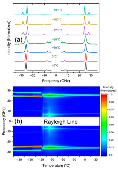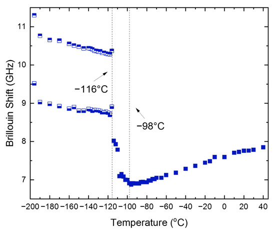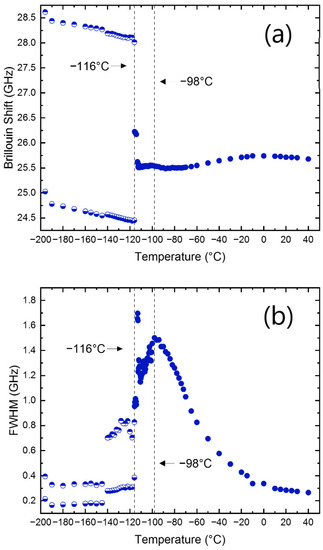 Brillouin spectra were measured by using a typical tandem multi-pass Fabry–Perot interferometer (TFP-2, JRS Co., Zürich, Switzerland). The free spectral range was 50 GHz, and the scan range was ±35.7 GHz. The typical finesse of the interferometer was around 100. A modified microscope (BH-2, Olympus, Tokyo, Japan) including a small prism for redirecting the laser beam, was used for the backscattering experiment. A diode-pumped solid-state single-mode laser (Excelsior 532−300, Spectra Physics, Santa Clara, CA, USA) at a wavelength of 532 nm was used as an excitation light source. A conventional photon-counting system combined with a multichannel analyzer (1024 channels) was used to detect and average the signal. The sample was put in a cryostat stage (THMS 600, Linkam, Tadworth, UK) for temperature control. All the measurements were taken in the temperature range from −196 °C to 40 °C.
