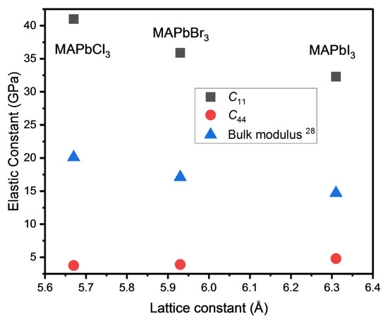 Figure 7 shows the change in the elastic constants as a function of the lattice constant (and, thus, X in MAPbX