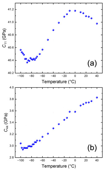 C11 changes from ~41.2 GPa at about 0 °C to ~40.4 GPa at −90 °C. In the case of